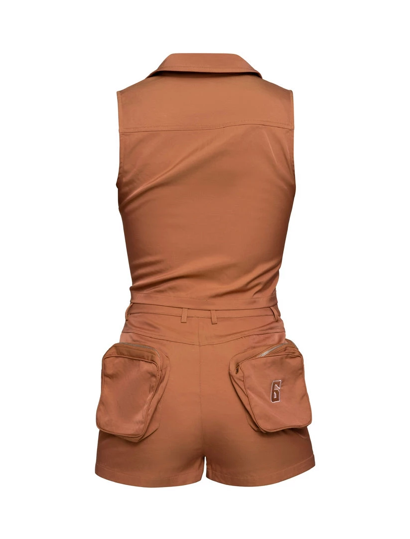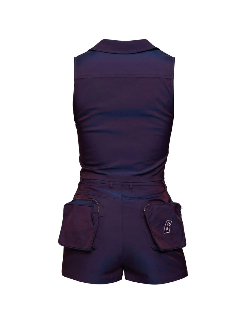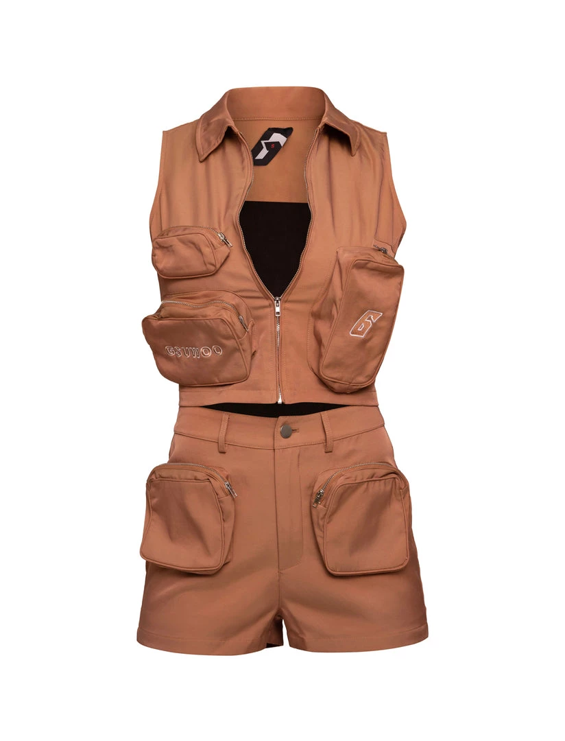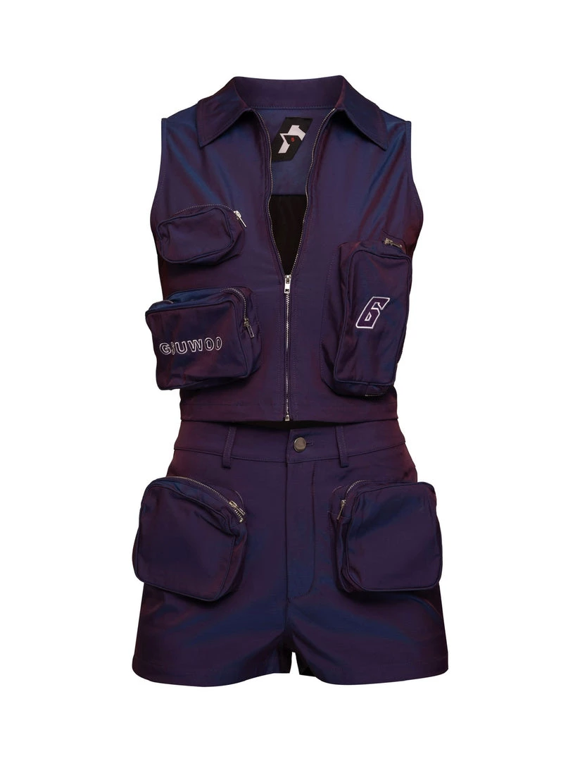 Pockets were the assignment for our new “G Cargo W” set (sold individually). G Cargo W is made of an iridescent fabric and features 3 pieces including a cargo vest, shorts and triangle bra. G Cargo has square, horizontal and vertical shaped pockets embroidered with our signature logos.Â