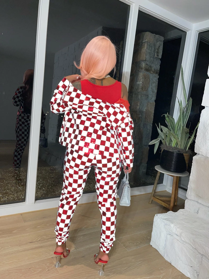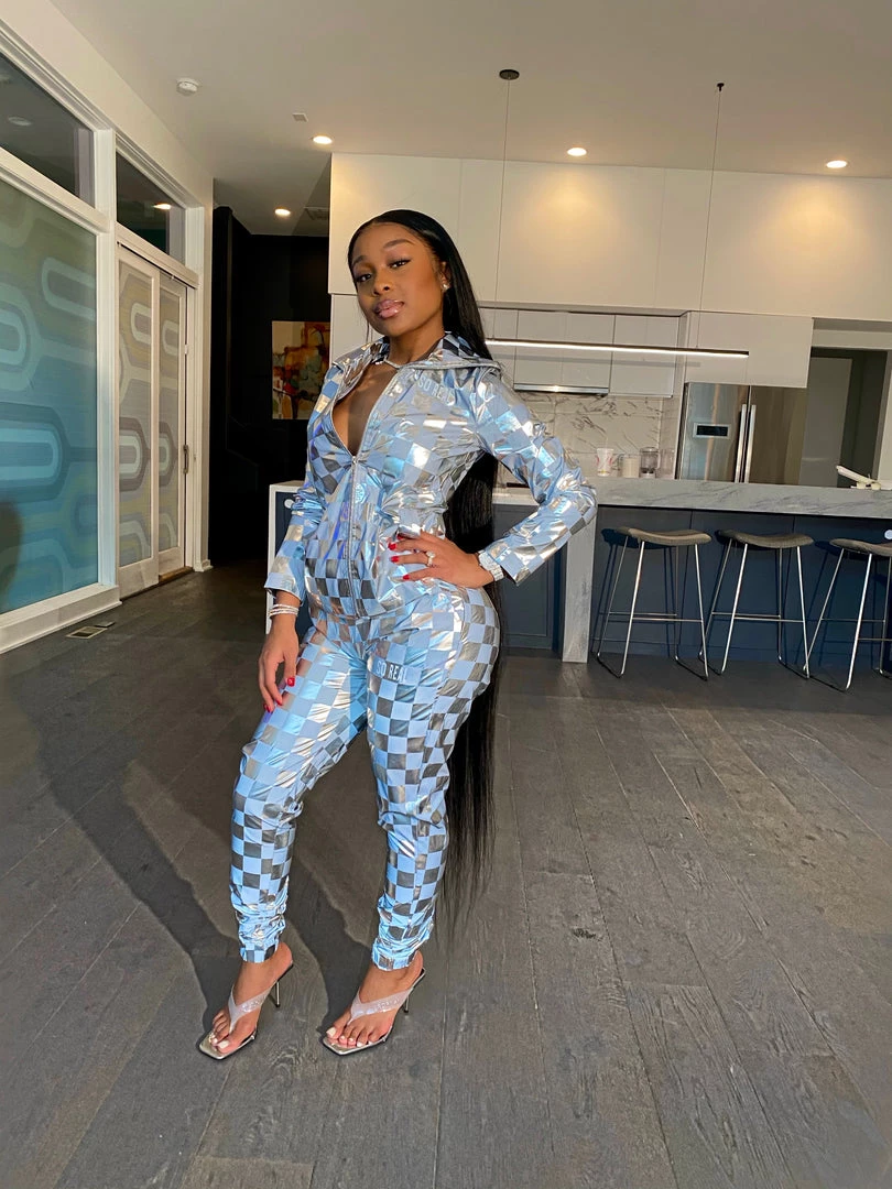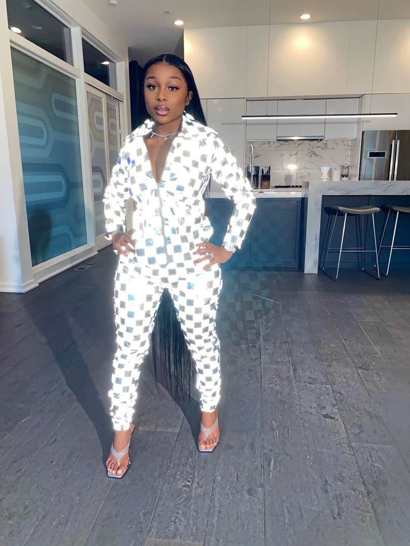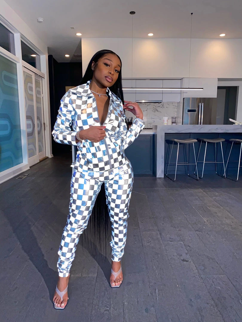 Are you playing Checkers or Chess? Our new Check Mate set is the statement piece you have been looking for! Made from reflective material this unique piece has a Checker board pattern. Our Check Mate Set comes as a two piece set top and bottom can ban be worn together or separate.