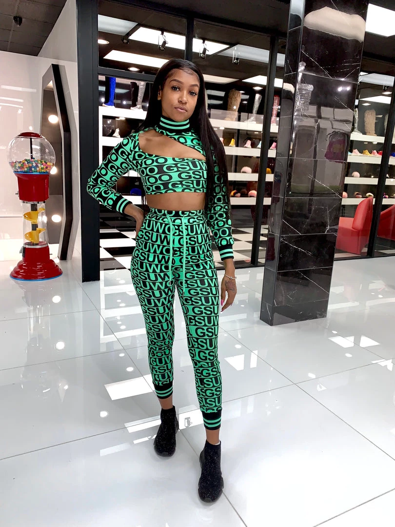 As part of our exclusive Atlanta, Georgia pop up, we created our “Gang Set” which is a form fitting two piece. The top has a unique cutout in the front, which can be supported by a strapless bra along with long sleeves with varsity stripped cuffs. The set also comes with pants included that are high waisted with pockets intact along with an adjustable drawstring. Our Gang Set can be worn during the day or night and can be worn as a simple outfit or dressed to impress. This set isn’t limited to heels or sneakers, both will give it an appealing look.Â
