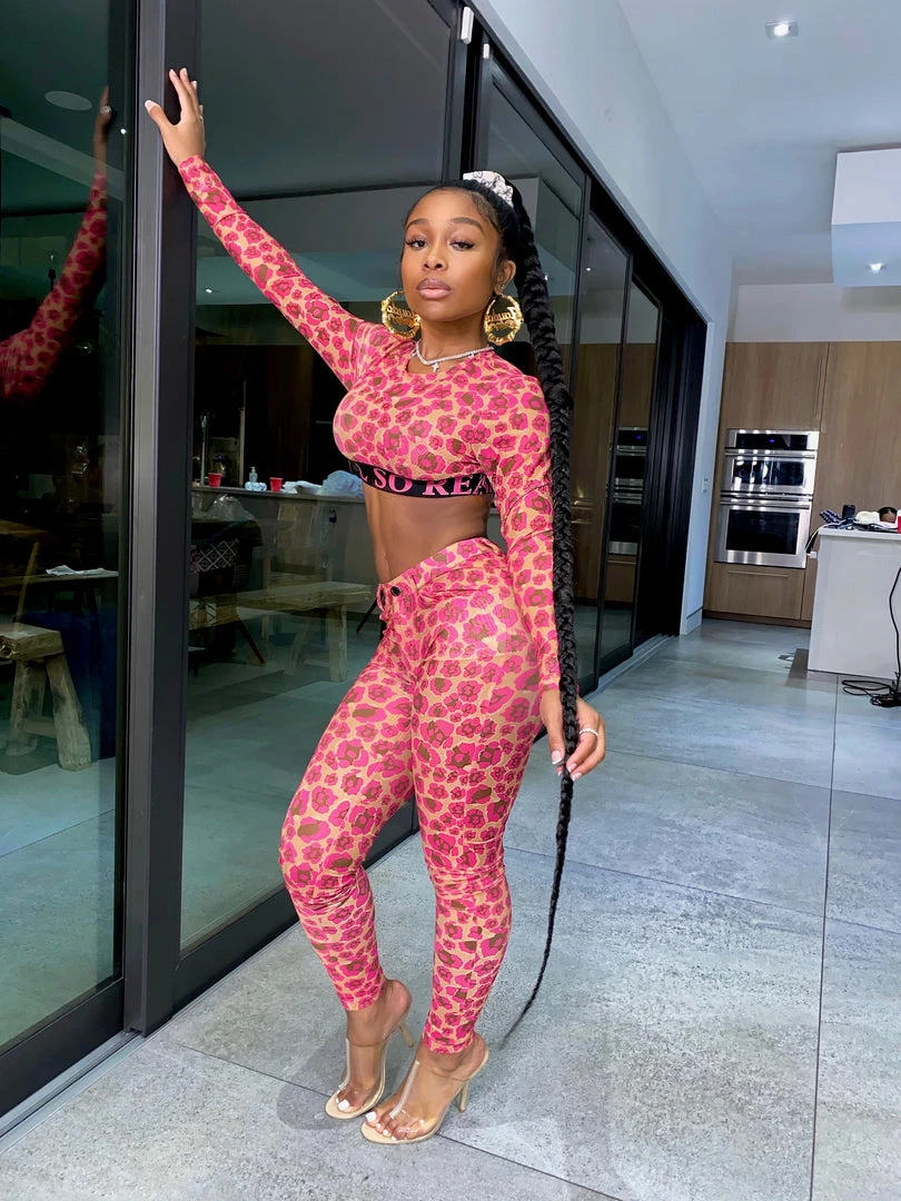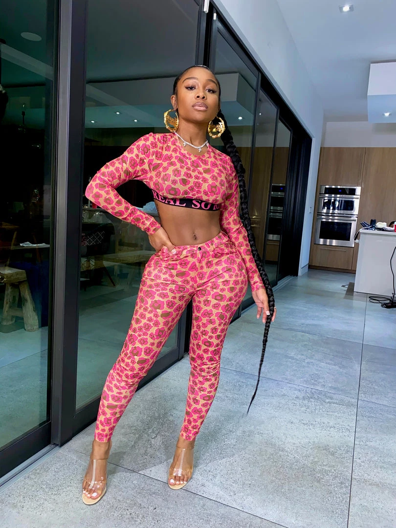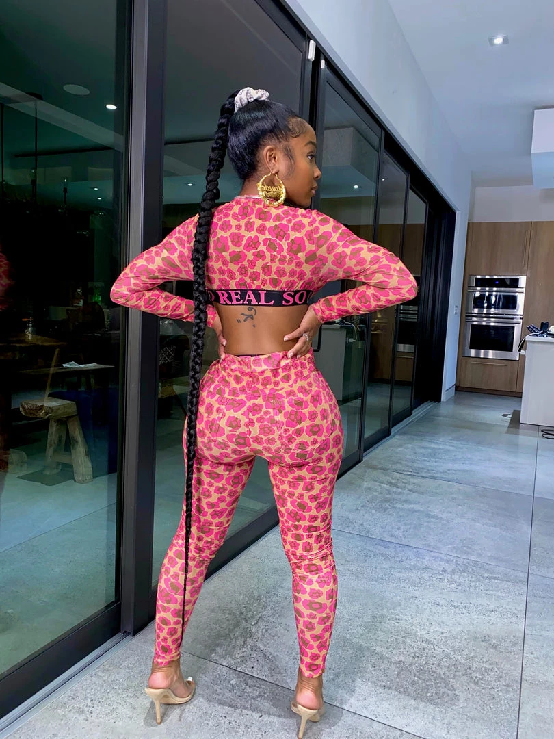 Giving Wild Thoughts in this sizzling two piece set! Sexy Safari is a mix of sexy, glamorous, and wild! Featuring a long sleeve cropped top, long pants, mesh material, and our SR logo panty.