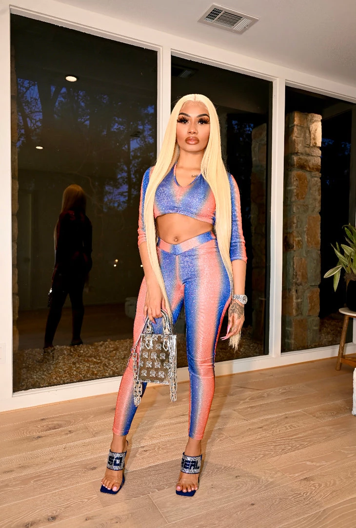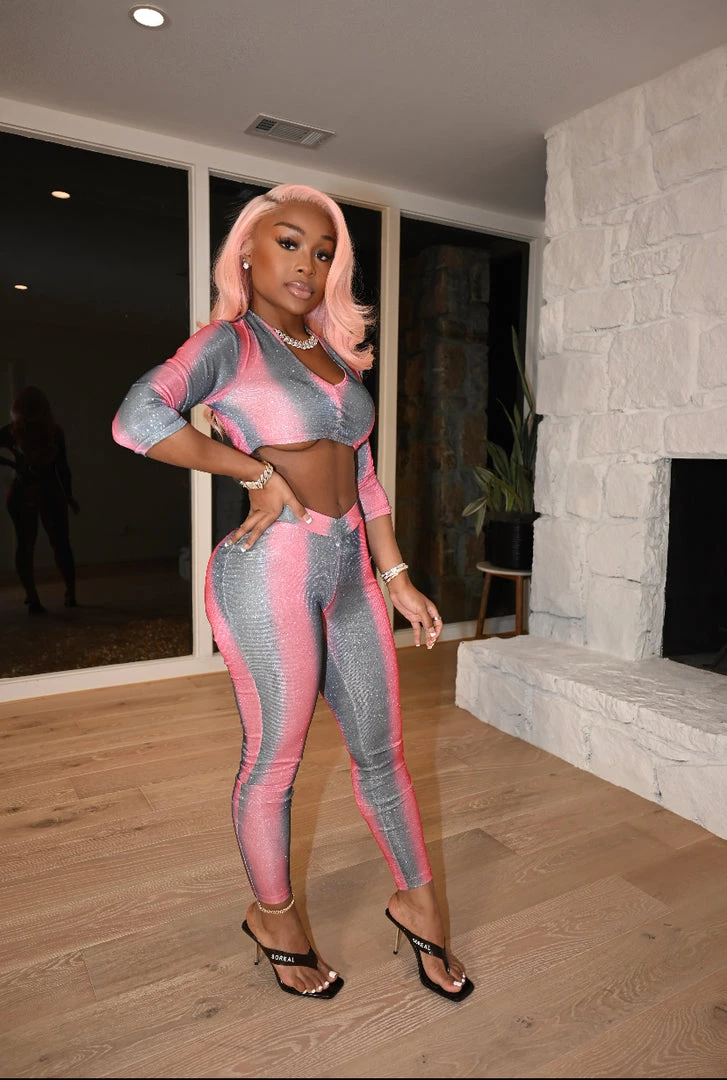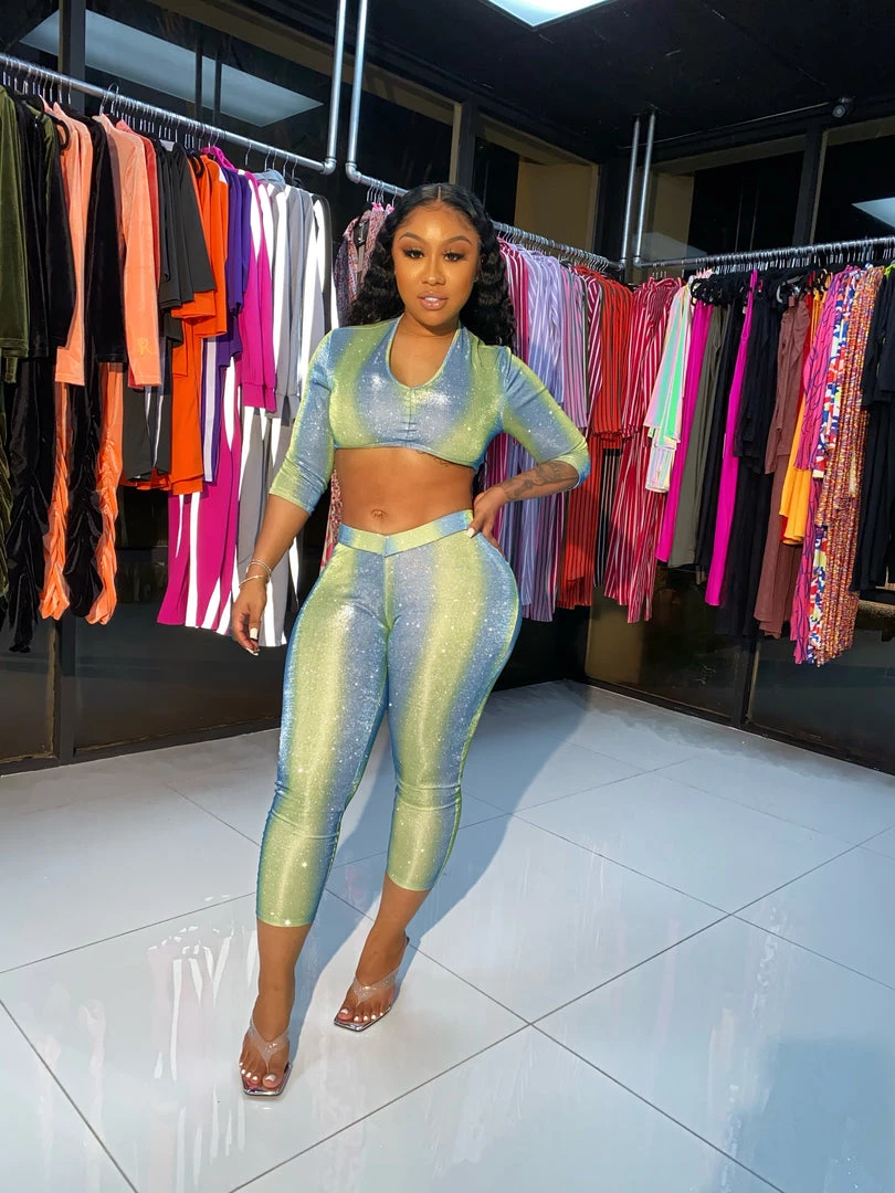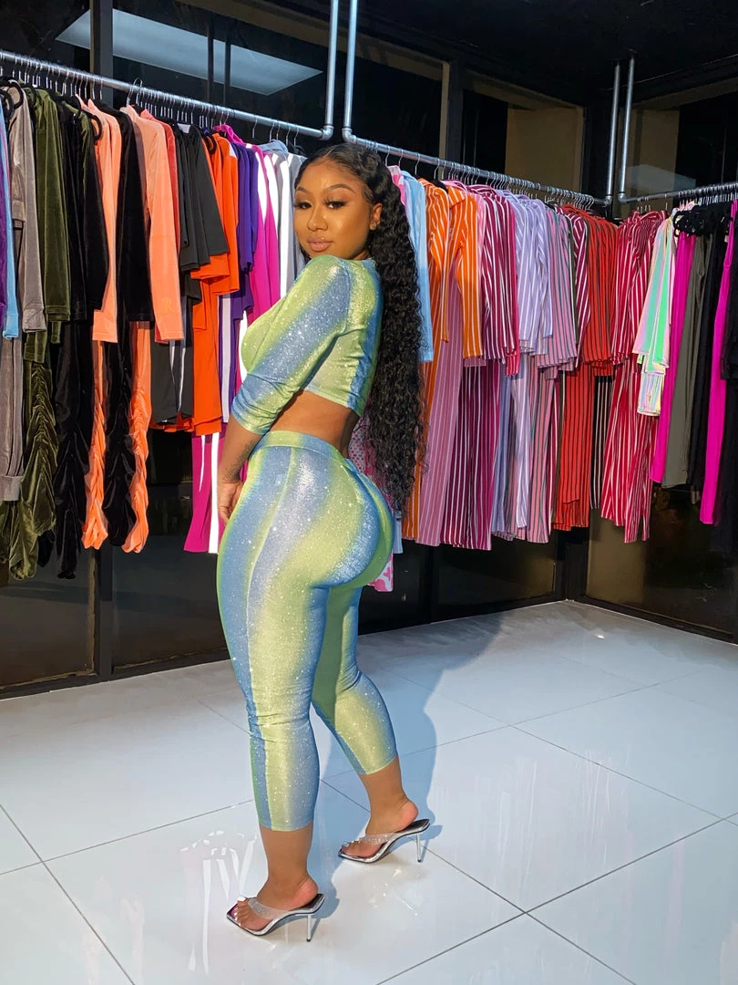 Shine bright like a diamond! Our new Sparkle set is a definite eye catcher and will make you the stand out in any room. Sparkle is make from a weaved glitter material, and comes with a cropped long sleeve top and a 3/4 tights. The tights a have a V shaped waistband and the crop top has a slight scrunch in the front.Â